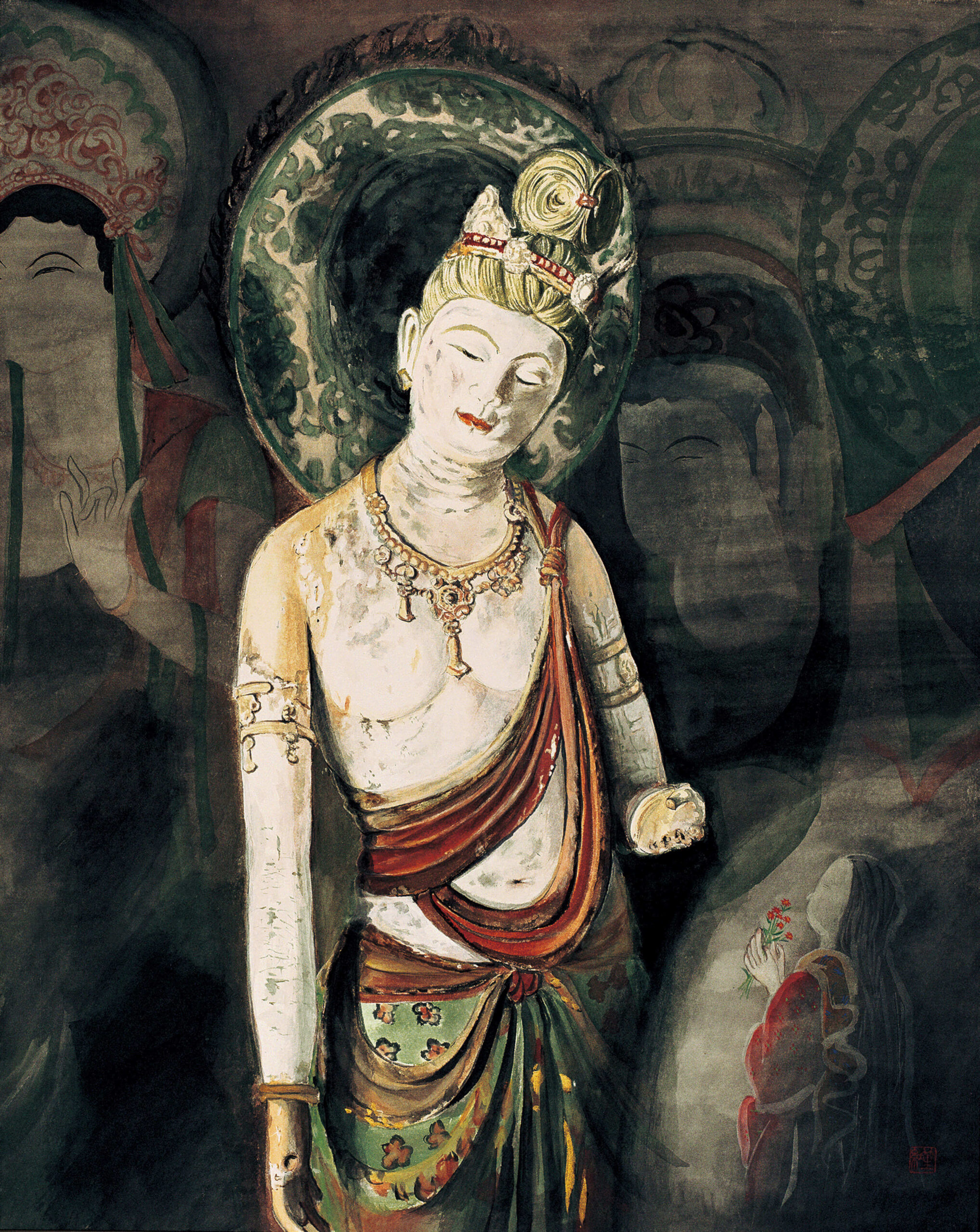 砂漠の大画廊と評される敦煌・莫高窟の中でも、文豪・井上靖が「恋人」と呼んだ盛唐を代表する45窟の塑像を描いた快作である。 「心の中の宇宙が共鳴するのを感じた」という画家は、画中に自らの姿を描き込むことで、”慈光”に輝く菩薩と一体となった。